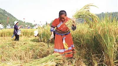 9月15日,一名参赛选手在使用传统镰刀收割水稻。