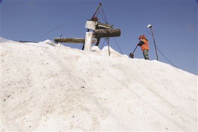 9月19日,连云港市一处盐场的工人将“秋扒”原盐进行堆放储备。