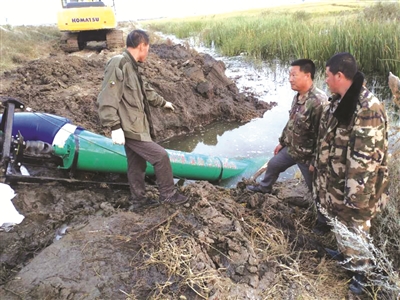 图为中华保险镇赉支公司捐赠的大功率排水泵助力稻田排水。