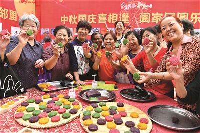 9月29日,社区居民展示一起制作的多彩月饼。当日,安徽省合肥市包河区金寨南路社区举办“邻里节 迎中秋”活动,社区居民齐聚一堂,动手制作多彩月饼,迎接中秋节的到来。 新华社记者刘军喜摄