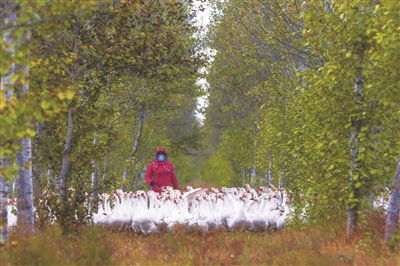 洮南市呼和车力蒙古族乡宏图村村民通过养殖大鹅取得了显著的经济效益。图为近日村民放鹅时的场景 。 邱会宁 范海辉摄