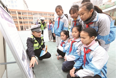 12月1日,贵州省铜仁市玉屏侗族自治县第二小学学生听交警大队民警讲解交通安全知识。 新华社发(胡攀学摄)