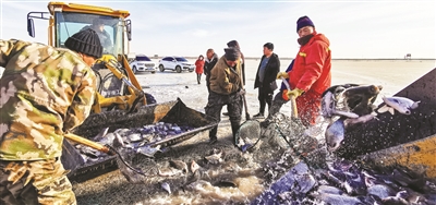 12月24日,白城市盐铺水库首开一网,渔民加紧进行冬捕作业,打出武昌鱼上万斤。
