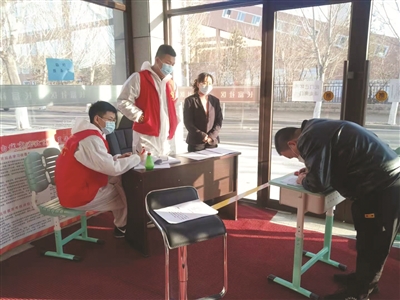 本报讯(实习生郁芷欢文/摄)听闻社区招募抗疫志愿者,白城市实验中学学生马欣淼和毓才中学学生王庆宇相约去当志愿者。在征得家长同意后,他们应征成为了洮北区新立街道长富社区抗疫志愿者。从1月20日开始,每天都在社区值守,为来往居民扫码登记、测量体温、帮助注册家庭医生。两人本是初中同学,这次在志愿工作中又和谐搭档。每当遇到情绪较为激动不愿配合登记的居民,马欣淼就负责安抚对方的情绪并说明这项工作在抗击疫情工作中的必要性,王庆宇则负责为其测温及扫码登记,使工作有序进行下去。