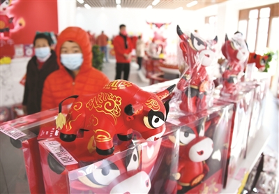 2月16日,游客在即墨古城文创礼品店选购牛年主题商品。