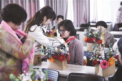 3月4日,在东林镇社区教育中心内,老师在教授丝巾的穿戴方式。