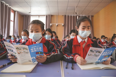 3月3日,河北省沙河市第四中学学生在阅读交通安全知识手册。