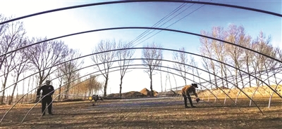 日前,洮南市福顺镇吉安村农民李红岩夫妇搭建大棚准备培育水稻苗。据了解,李家共有5个育苗大棚,稻苗可供自家8公顷水田所需,年收入可达20多万元。 本报记者李晓明摄