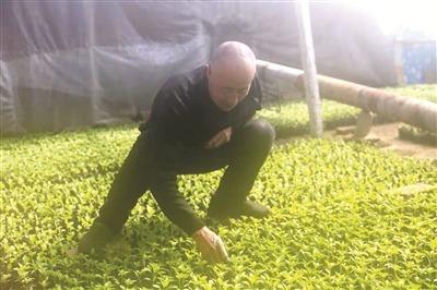白城经济开发区西郊街道保胜村二社刘宝昌,今年在暖棚里培育了4亩辣椒苗和茄子苗,现在长势良好。图为刘宝昌查看秧苗。 本报记者王野村摄
