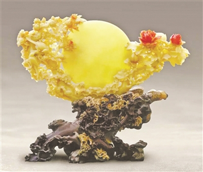 上世纪80年代以来,青田石雕百花齐放,诞生了周百琦《春》、倪东方《花好月圆》、张爱廷《丰收》等国宝级作品。倪东方的代表作《花好月圆》,薄薄一片灯光冻打磨成一轮满月,纯洁到极致,两旁缀以花鸟,牡丹正艳,双鹂啁啾,枯藤老树底座。构图、造型、雕工、色彩,无一不令人拍案叫绝。
