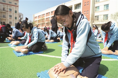 4月28日,甘肃省兰州市华侨实验学校学生练习急救技能。