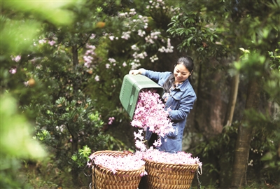 5月5日,赤水市长沙镇长兴村村民将刚采摘的金钗石斛鲜花装筐。