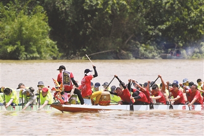 6月13日,在福州市闽侯县大樟溪南港段,两艘民间龙舟在端午竞渡中奋勇争先。