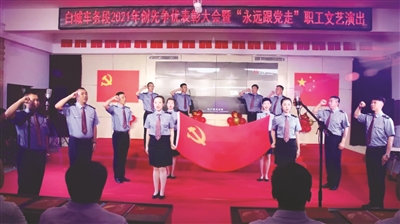 为庆祝中国共产党成立100周年,进一步展示创先争优成果,激励全段各级党组织和广大共产党员再立新功,6月24日,白城车务段党委召开2021年创先争优表彰大会暨“永远跟党走”职工文艺演出。图为党员重温入党誓词。 张彦彬 苏阳摄