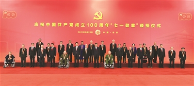 颁授仪式后,习近平等领导同志同“七一勋章”获得者合影留念。