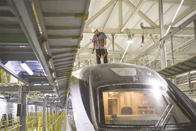 7月11日,银川动车运用所工作人员在检查列车顶部盖板。今年暑运以来,中国铁路兰州局集团有限公司兰州车辆段银川动车运用所针对车次密集、高温天气等情况进行充分研判,加强检修、清洁工作,每日对列车进行全面“体检”,确保动车运行安全,为旅客提供舒适的乘车环境。 新华社记者冯开华摄