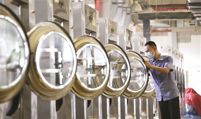 中国铁路北京局集团有限公司北京客运段为保障旅客出行安全,加强列车卧具、窗帘、台布洗涤过程中的防疫消毒工作,北京客运段洗涤车间的所有洗涤物品都要经过洗涤前消毒、高温洗涤、灭菌洗涤和高温熨烫四道消杀灭菌工序,保障铁路出行安全。 新华社记者李欣摄