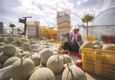 宁夏灵武市郝家桥镇泾灵新村是一个生态移民村。近年来,泾灵新村引进企业发展蜜瓜种植,流转1500余亩土地,建设大跨度连栋大棚,采用“支部+企业+基地+农民”以销定产的订单农业模式,带动300余名农民增收致富,助力乡村振兴。 新华社记者杨植森摄