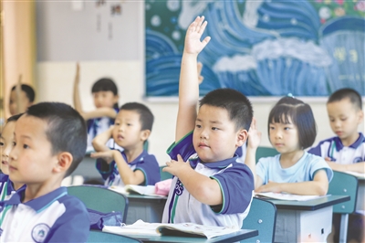 9月22日,泸州市泸县天立小学一年级一班的学生在课上举手回答问题。