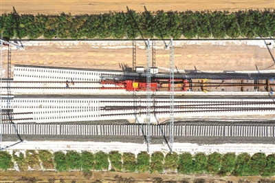 9月27日,铺轨机在京唐城际铁路铺轨现场作业(无人机照片)。
