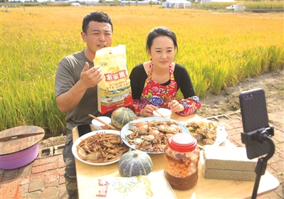 洮南市蛟流河乡先锋村村民王春雨王贺夫妇以“牙哥农村生活”网名在快手拍段子、进行网络直播带货,10个多月吸引近16万个粉丝关注,网上带货达到1.2万单,把农村幸福生活和家乡农产品展示推广到全国各地。图为近日夫妇俩在田间地头直播销售。 邱会宁 范海辉摄