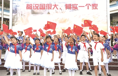 9月30日,广西南宁市滨湖路小学的孩子们演唱歌曲《国家》。