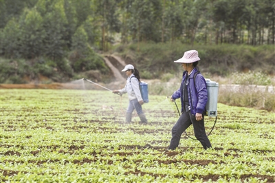 11月23日,在广西武宣县禄新镇大荣村,村民在育苗基地内喷洒叶面肥。
