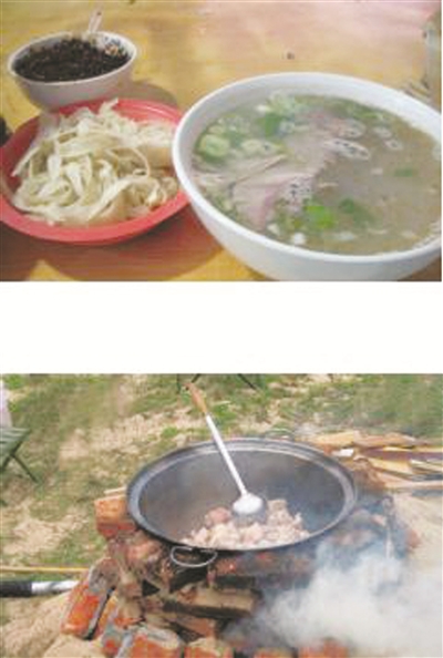 羊汤极具风味,最典型的做法是将两年至三年的肥羊宰杀、接血、去皮,将内脏取出,肠、肚清理干净,将羊窠裸不去骨分割成小块。分锅将肉、肚、肠“紧”一下,漂去血沫脏物,用清水洗净,将内脏、肉等煮熟。羊血煮熟后,放清水中凉透,然后将带骨的肉及心、肺、肠、肚、血切成条,一同放入锅中,不加作料慢炖两至三个小时,至汤呈乳白色,装盆上桌,由食客自行盛入碗中食用。桌上放醋、盐、蒜末、香菜等调料,依据口味自己向汤中添加。这道菜不膻不腻,烂熟纯香,天然纯朴。