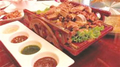 滚刀肉即红烧羊脖子。把新鲜羊脖子洗净煮熟,再伴以作料红烧,做成后呈肉红色,大盘上桌,光泽鲜艳,看之就已令人垂涎欲滴。其肉鲜美不腻,骨烂筋熟,香嫩可口。因为似肉墩形,食用时必须用刀或筷子撕下肉来,大家轮流割肉吃,这肉墩就在盘子里滚来滚去,因而这道菜得名滚刀肉。
