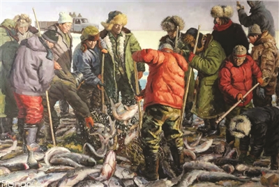 马翔创作的油画《北方渔猎文化系列—千里冰封捕鱼忙》,画面人物众多,节奏很难把握。人物之间的关系如何处理,站位如何排列,比重如何协调,看似简单的场景,处理得不好,人物就会显得拥挤,画面就会显得凌乱、平庸。马翔把人物先分组再聚合,整体错落有致,如同一首音乐的音符般排布,和谐而统一。