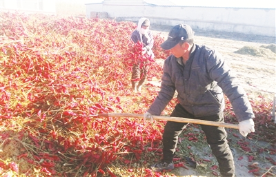 通榆县突出“以城带乡、以工补农、城乡互动”的发展思路,构建起“龙头在城内,龙尾在乡村”的城乡产业发展新格局。截至目前,该县农业产业化重点龙头企业达到37家,庭院经济面积发展到7.5万亩,规模化、特色化、品牌化趋势得以显现。图为通榆县幸福村农民晾晒辣椒场面。 王志鹏 朱相龙 本报记者张殿文摄