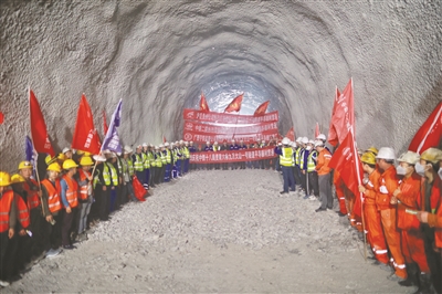 12月5日,工作人员庆祝九万大山一号隧道平行导洞贯通。