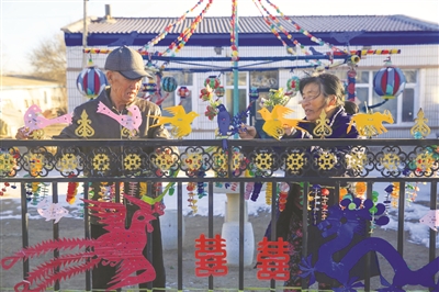 洮南市聚宝乡长久村村民杜长茂、李淑兰夫妇,在驻村工作队的帮助下,日子越来越富裕。农闲时,他们通过废物再利用,制作出各式各样的剪纸及装饰品,将庭院装点得新颖亮丽,吸引村民们前来欣赏。 邱会宁 范海辉摄