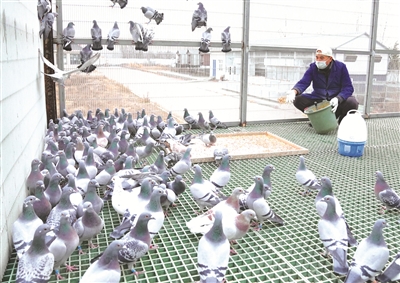 12月11日,迁安市大崔庄镇一家信鸽养殖基地的工人在给鸽子投放饲料。