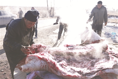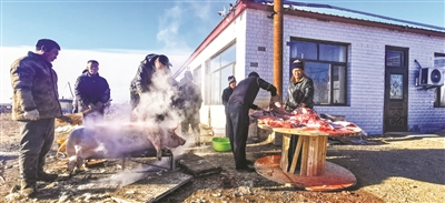 杀年猪,庆丰收,是东北地区的一种传统年俗。每年下过雪后,冰面刚封,便会陆续有村民杀猪,村里只要一杀猪,满村都会充满喜庆。家家户户的大锅内冒着热气,飘着肉香,人人脸上挂着笑容,满是幸福的味道。本报记者 李晓明 李政孚 摄影/报道