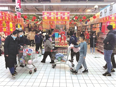 元旦来临,我市节日市场商品琳琅满目、储备充足,蔬菜、水果、饮料、衣物等商品应有尽有,人们随意选购。图为市民在市区大润发超市购物。 本报记者 王野村摄