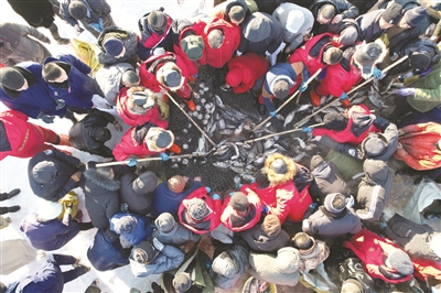 经过多轮激烈竞价,哈尔淖冬捕的头鱼由北京天润东方清洁能源科技有限公司以38.8万元的价格拍得。截至2021年12月29日,哈尔淖冬季捕鱼已经达到10万公斤,冬捕计划捕鱼30万公斤以上。