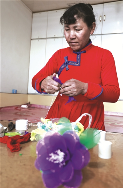 近日,洮南市胡力吐蒙古族乡村民邰思芹在农闲时从快手上学会了工艺品花卉制作。为迎接虎年春节,邰思芹将制作的工艺品花卉用来装饰房间。 本报记者李晓明摄