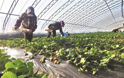“这是我们村种植的丹东99草莓和圣女果,均用农家肥为营养肥料,用蜜蜂自然授粉,果实鲜香甜脆,营养丰富……”说起新德村现代农业产业园的特色“招牌”产品,福顺镇党委副书记、镇长盛利的脸上写满了自豪与骄傲。“现在可出产品的60栋大棚,每栋大棚每天可产40公斤草莓,10公斤圣女果,按目前的长势和产量来看,整个产业园一天就可出果3000公斤左右。”盛利算起了经济账,“以现行市场价格,草莓60元/公斤、圣女果20元/公斤计算,仅2022年1月到3月初的这两个销售旺季来说,大概就可收入930余万元……”掰着手指,盛利算出了一个令人咋舌的数字。“占地63公顷的现代农业产业园,一期投资870万元,建有44栋高标准日光温室大棚、15栋冷棚和2栋15000平方米连体冷棚,二期投资1500万元,建设恒温库、草莓加工车间各一座,以及暖棚16栋。带动周边农户就业稳定岗位65人,临时性岗位1000余人,现可实现年产值1500余万元。”一栋栋大棚,俨然已成为农民增收的“聚宝棚”,望着眼前那一片片生机盎然的葱茏,似乎在向人们传达着农家增收的喜悦,那一处处绿肥红艳,有如欢快律动的音符在冬日的沃野上舞动跳跃……