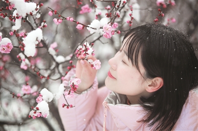 2月7日,在江苏扬州瘦西湖风景区,游人在雪中赏梅。