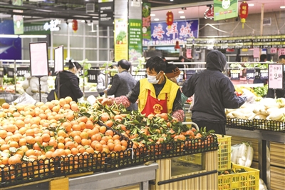 2月9日,工作人员在广西德保县一家超市内补充投放新鲜水果。