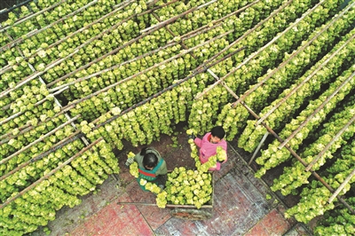 2月12日,在重庆市黔江区金溪镇,村民在晾晒青菜头(无人机照片)。