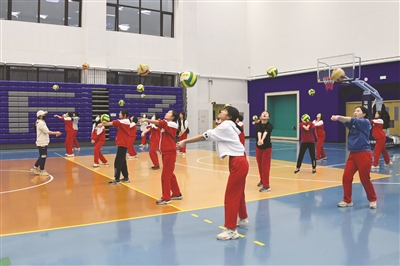 2月21日,在北京大学附属中学,初三年级学生在体育课上进行排球训练。