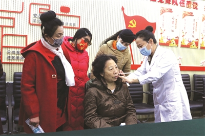 不久前,洮北区明仁街道红叶社区联合市区陈氏理疗馆义诊志愿服务队在市区红叶小区共同举办了“爱心义诊”进社区活动。志愿服务队队员以健康知识讲座、答疑、现场针灸等形式,无偿为社区居民进行健康检查,普及正确的卫生安全和健康养护知识。图为志愿服务队队员为居民针灸。 本报记者段卫军摄