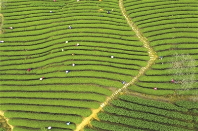 3月20日,在浙江省余姚市兰江街道一茶场,茶农在采摘茶叶(无人机照片)。