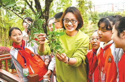 3月31日,陕西省级教学能手、岚皋县城关第二小学教师王晓君(中)带领学生在巴山珍稀植物园开展实践活动。