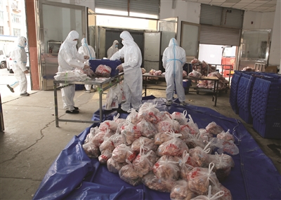 8时30分,欧亚购物中心60名工作人员在副总经理邓嘉鑫带领下开始给蔬菜打包。9个小时穿梭忙碌,成吨的蔬菜变身为近千份蔬菜包,志愿者、社区干部马不停蹄地送往千百个家庭。