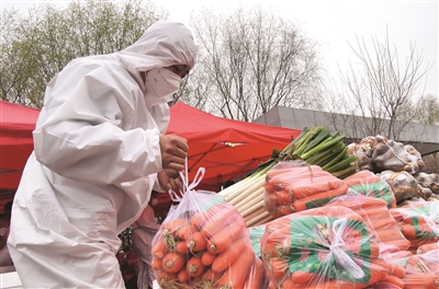4月11日,在中国供销农产品(沈阳)集配中心,沈抚改革创新示范区志愿者在分拣蔬菜。