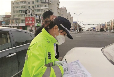 图为张月宾在路面检查中进行人员、车辆登记。 于洪涛摄