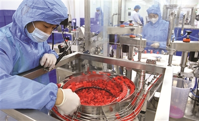 4月14日,西安天隆科技样本保存液生产线的工作人员在进行灌装作业。